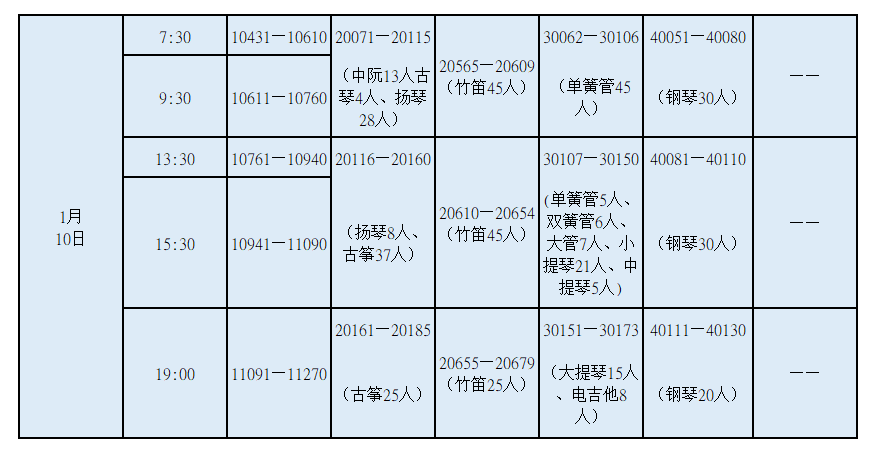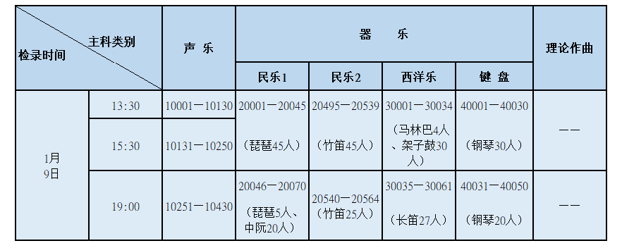 (十)主科考試時間及次序均由計算機程序隨機安排,考生應嚴格按照公布的檢錄時間參加檢錄、考試,3次檢錄不到者按自動放棄處理,無論何種原因,一律不再安排補考;考生檢錄后不得以任何理由要求緩考或變更面試次序。除鋼琴外,其它樂器由考生自備。