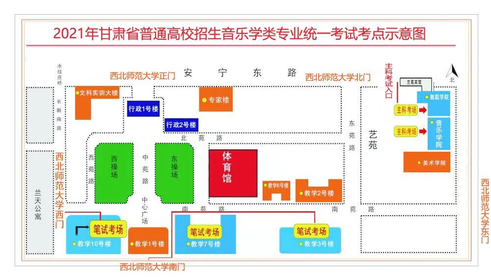 為做好新冠疫情疫情防控工作,確保考生順利入場,考生須按照規定的出入口及路線出入相應考點。考生應提前在考點門口排隊,預留足夠時間配合考點工作人員進行入場核驗。具體路線見《2021年甘肅省普通高校招生音樂學類專業統一考試考點示意圖》。