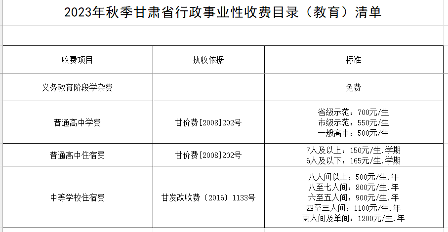 根據(jù)2023年秋季甘肅省行政事業(yè)性收費目錄(教育)清單,中小學(xué)收費標(biāo)準(zhǔn)分別為: