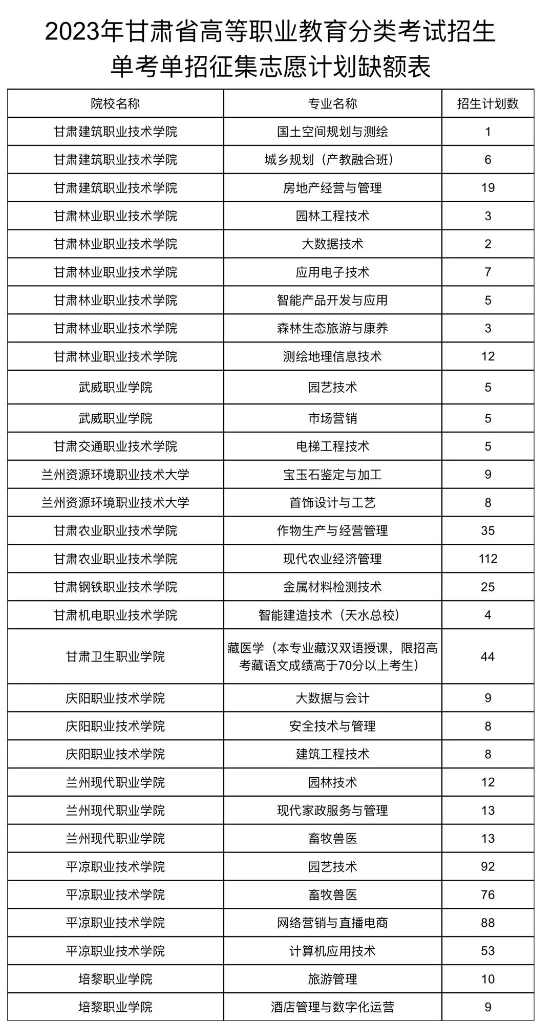 附件:2023年甘肅省高等職業教育分類考試招生單考單招征集志愿計劃缺額表