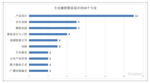 據統(tǒng)計,11個高校取消產品設計專業(yè),各有5個高校取消音樂表演和舞蹈表演專業(yè)設置,具體情況如下圖: