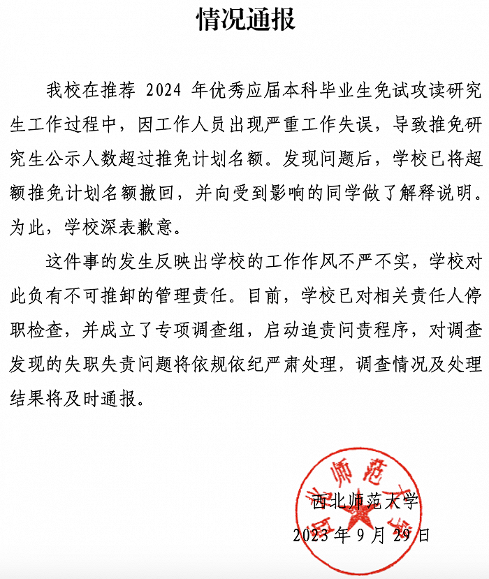 出現(xiàn)嚴(yán)重工作失誤!西北師范大學(xué)通報…