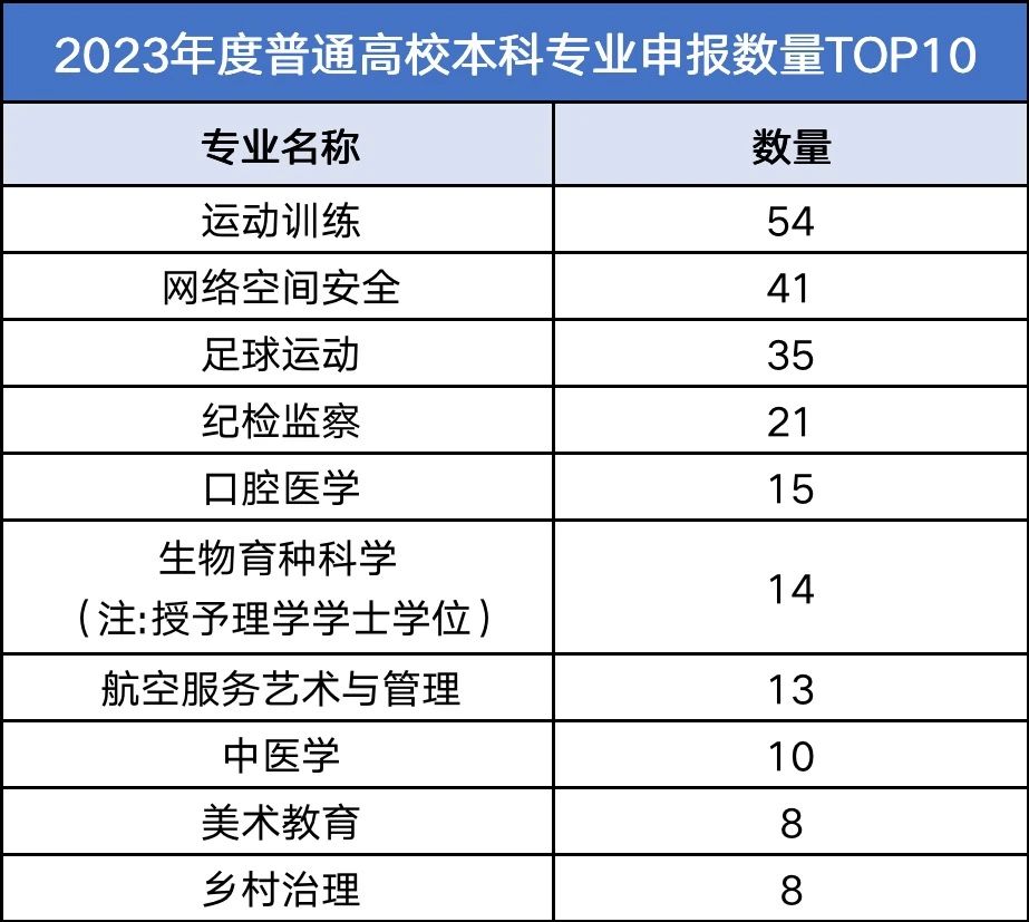從申報(bào)的專業(yè)來看,2023年度共申報(bào)180個(gè)專業(yè)。其中,申報(bào)數(shù)量TOP5專業(yè)包括:運(yùn)動(dòng)訓(xùn)練(54個(gè))、網(wǎng)絡(luò)空間安全(41個(gè))、足球運(yùn)動(dòng)(35個(gè))、紀(jì)檢監(jiān)察(21個(gè))、口腔醫(yī)學(xué)(15個(gè))