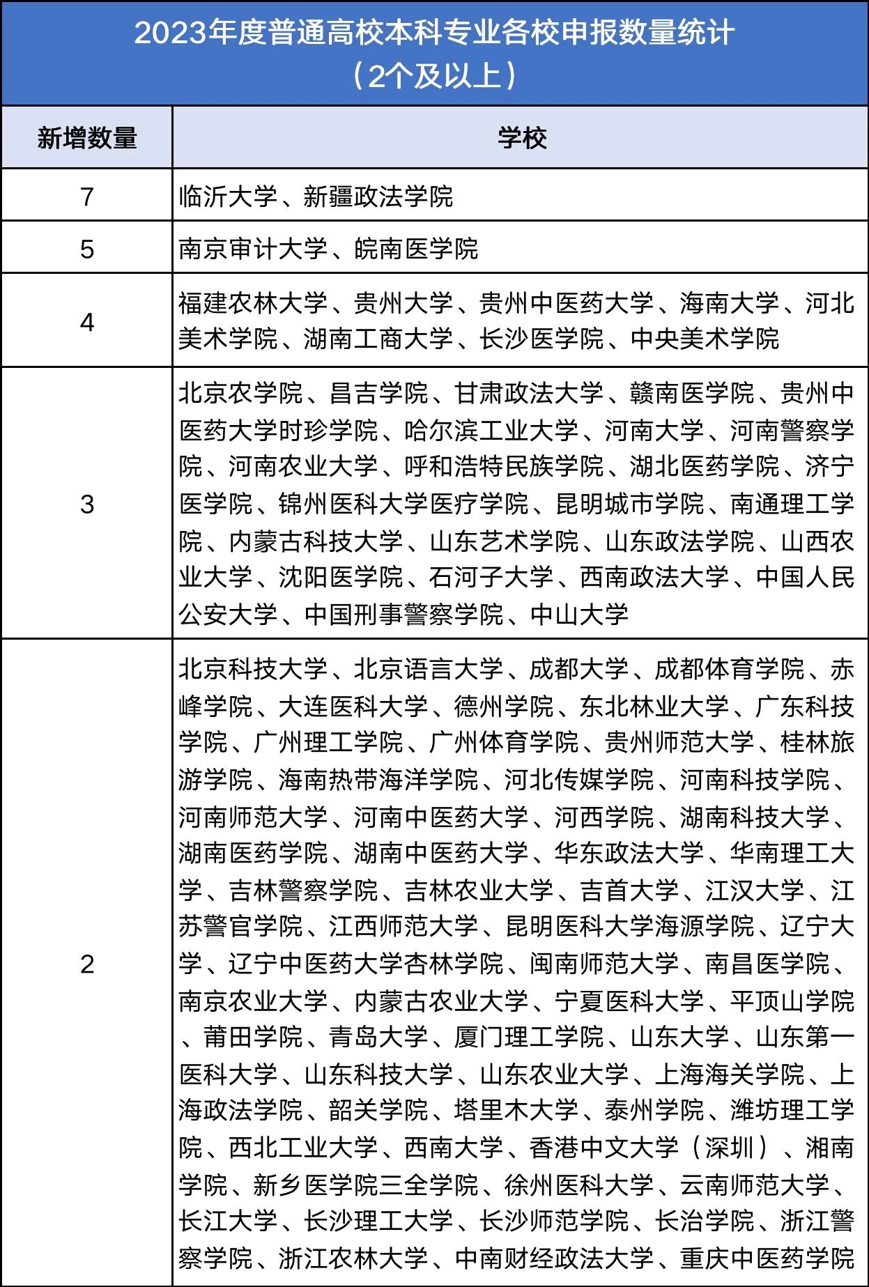以下是本次申報(bào)專業(yè)數(shù)量達(dá)到2個(gè)及以上的高校統(tǒng)計(jì)