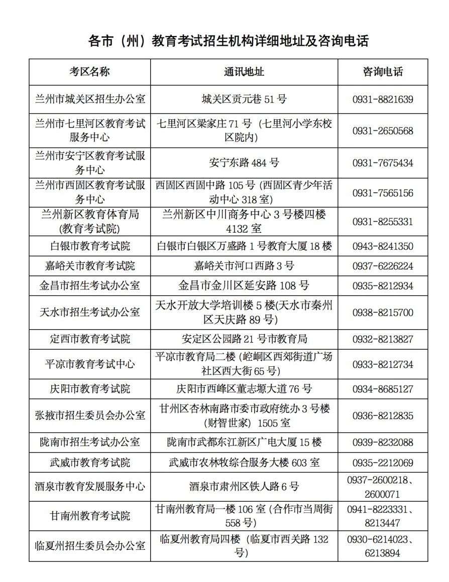 特別提醒:請考生密切關注各考區考點官網或微信公眾號,及時了解本考區考點入場流程及有關規定,避免影響正常考試。各考區咨詢電話及通信地址見附件