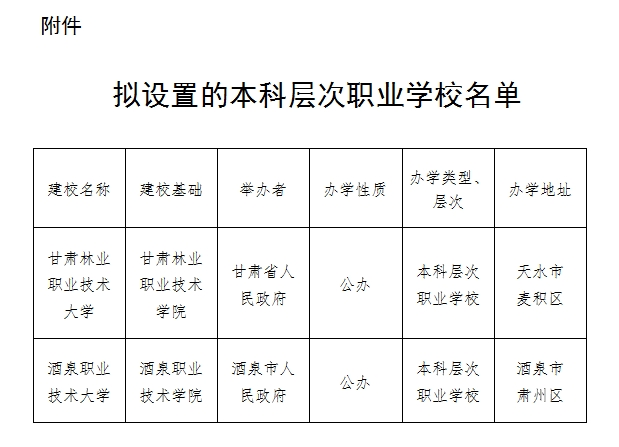 以甘肅林業職業技術學院為基礎設置甘肅林業職業技術大學、以酒泉職業技術學院為基礎設置酒泉職業技術大學
