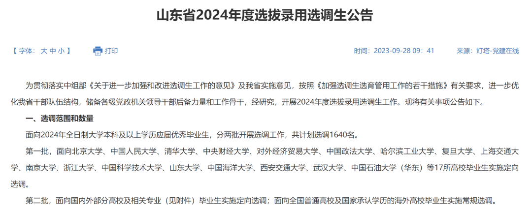 山東省2024年選調生選拔面向2024年全日制大學本科及以上學歷應屆優秀畢業生,分兩批開展選調工作,共計劃選調1640名。