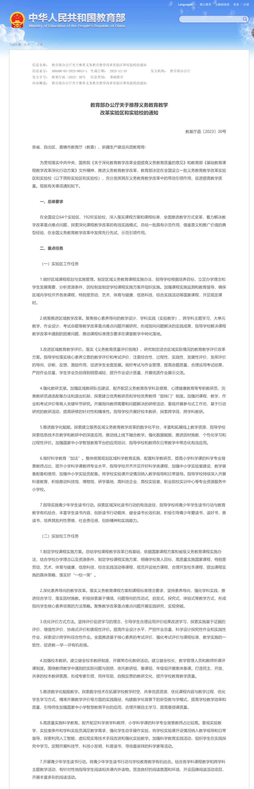 近日,教育部辦公廳印發關于推薦義務教育教學改革實驗區和實驗校的通知,決定在全國設立一批義務教育教學改革實驗區和實驗校,并公示了義務教育教學改革實驗區和實驗校名單。