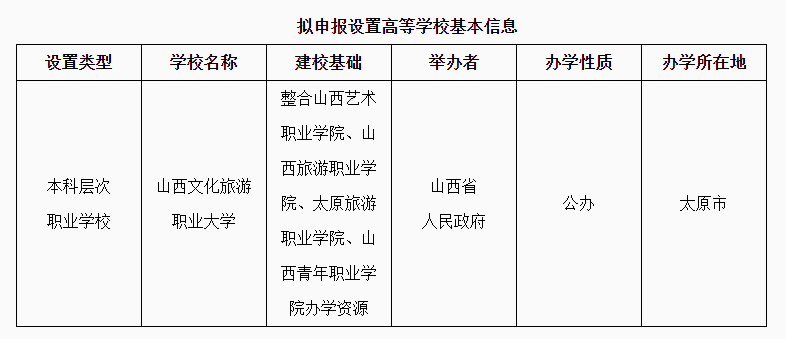 2023年12月20日,山西省教育廳官網發布“關于擬申報設置高等學校的公示”。經省高校設置專家組考察評議通過,現將設置山西文化旅游職業大學予以公示。