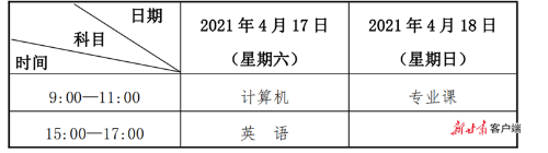 高職(專科)升本考試時(shí)間為4月17日至4月18日,考試科目分為公共課和專業(yè)課,公共課為計(jì)算機(jī)、英語,每科滿分150分;專業(yè)課滿分為200分。