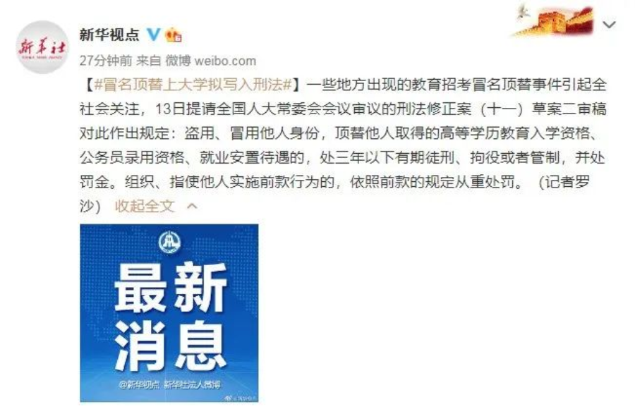 一些地方出現的教育招考冒名頂替事件引起全社會關注,13日提請全國人大常委會會議審議的刑法修正案(十一)草案二審稿對此作出規定:盜用、冒用他人身份,頂替他人取得的高等學歷教育入學資格、公務員錄用資格、就業安置待遇的,處三年以下有期徒刑、拘役或者管制,并處罰金。組織、指使他人實施前款行為的,依照前款的規定從重處罰。