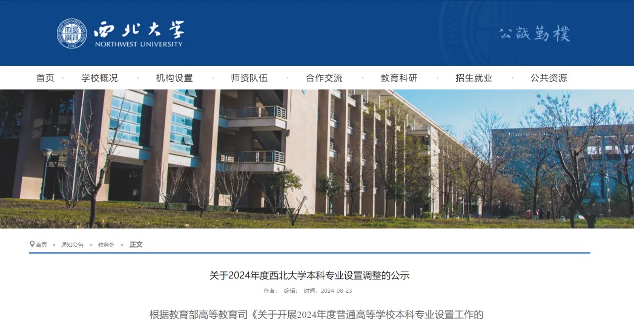 網(wǎng)站近日發(fā)布了《關(guān)于2024年度西北大學(xué)本科專業(yè)設(shè)置調(diào)整的公示》,