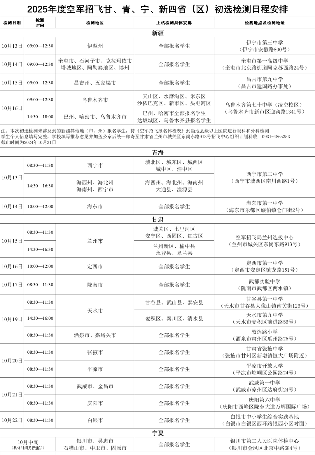 2025年度空軍招飛甘、青、寧、新四省(區)初選檢測安排