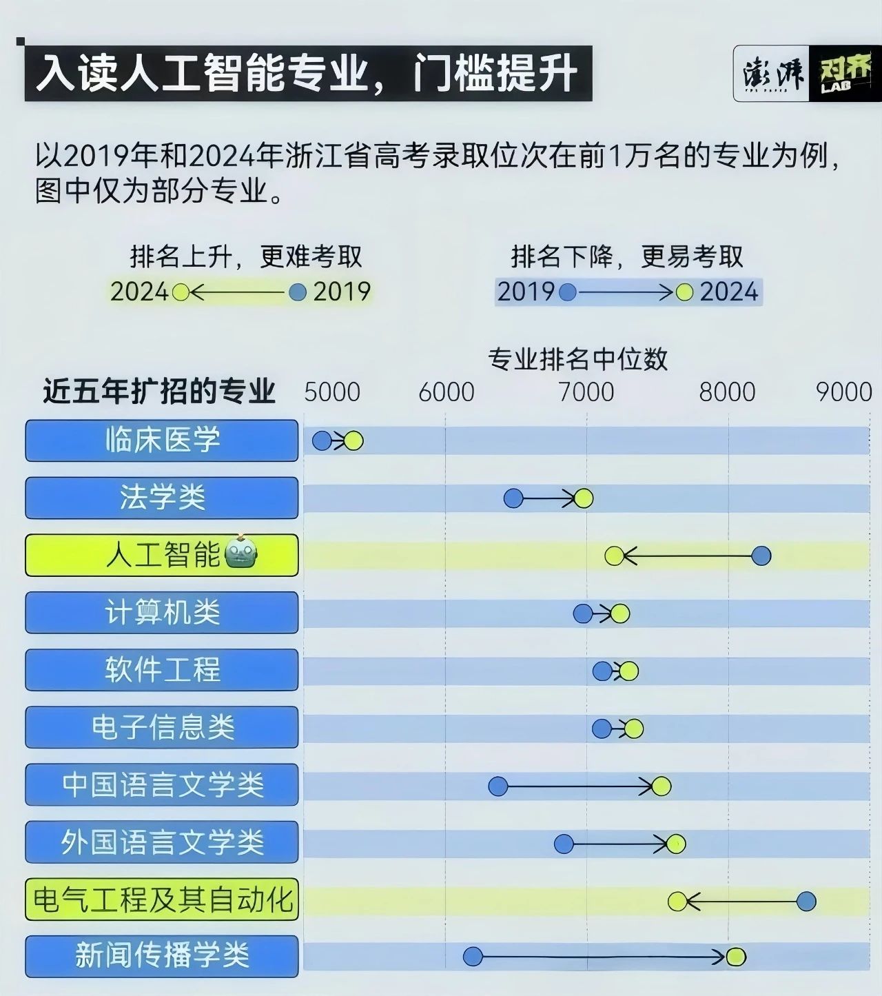 以浙江為例。2019 年,人工智能專業首次在浙江招生。錄取位次在前1萬名的專業中,人工智能專業錄取的排名中位數在 8235 名。5 年后,人工智能專業錄取的排名中位數上升到 7195 名。值得一提的是,這種排名上升,是在人工智能專業招錄規模擴大的前提之下,這更說明了專業走俏。