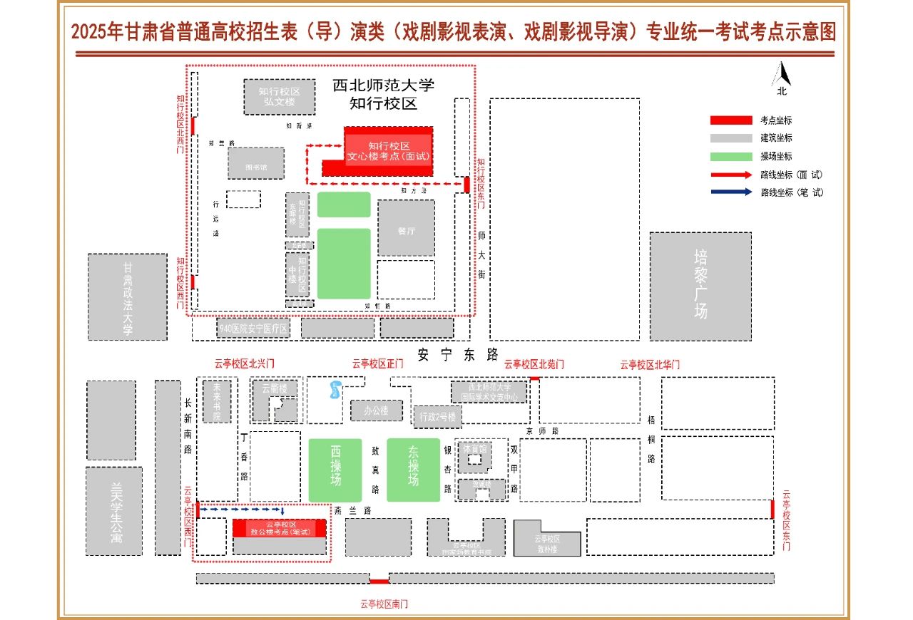 筆試考點設(shè)在西北師范大學(xué)云亭校區(qū)(地址:蘭州市安寧區(qū)安寧東路967號);