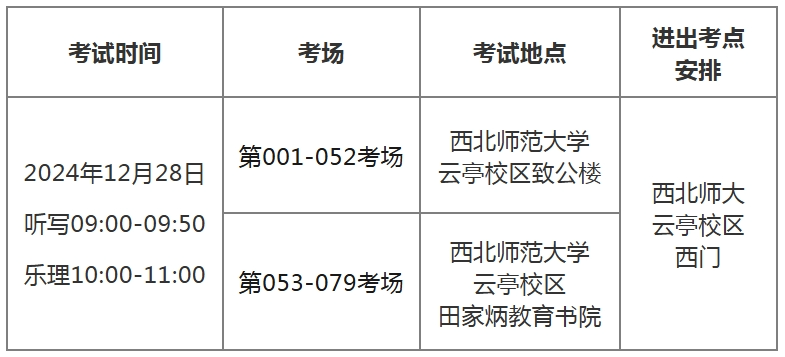 1.考生在參加聽寫、樂理科目筆試時應(yīng)在西北師范大學(xué)云亭校區(qū)西門排隊進(jìn)入學(xué)校,根據(jù)路標(biāo)指引到相應(yīng)考點門前排隊,由考點工作人員進(jìn)行入場核驗。開考45分鐘前,考生開始入場;開考15分鐘后,遲到考生不得入場(考試封閉區(qū)域);考試全程,考生不得離開考場。
