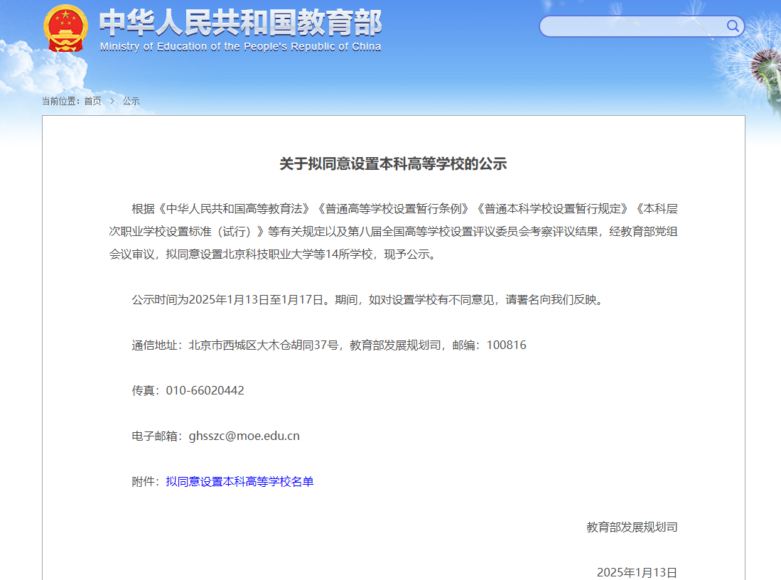 1月13日,教育部發布關于擬同意設置本科高等學校的公示。根據《中華人民共和國高等教育法》《普通高等學校設置暫行條例》《普通本科學校設置暫行規定》《本科層次職業學校設置標準(試行)》等有關規定以及第八屆全國高等學校設置評議委員會考察評議結果,經教育部黨組會議審議,