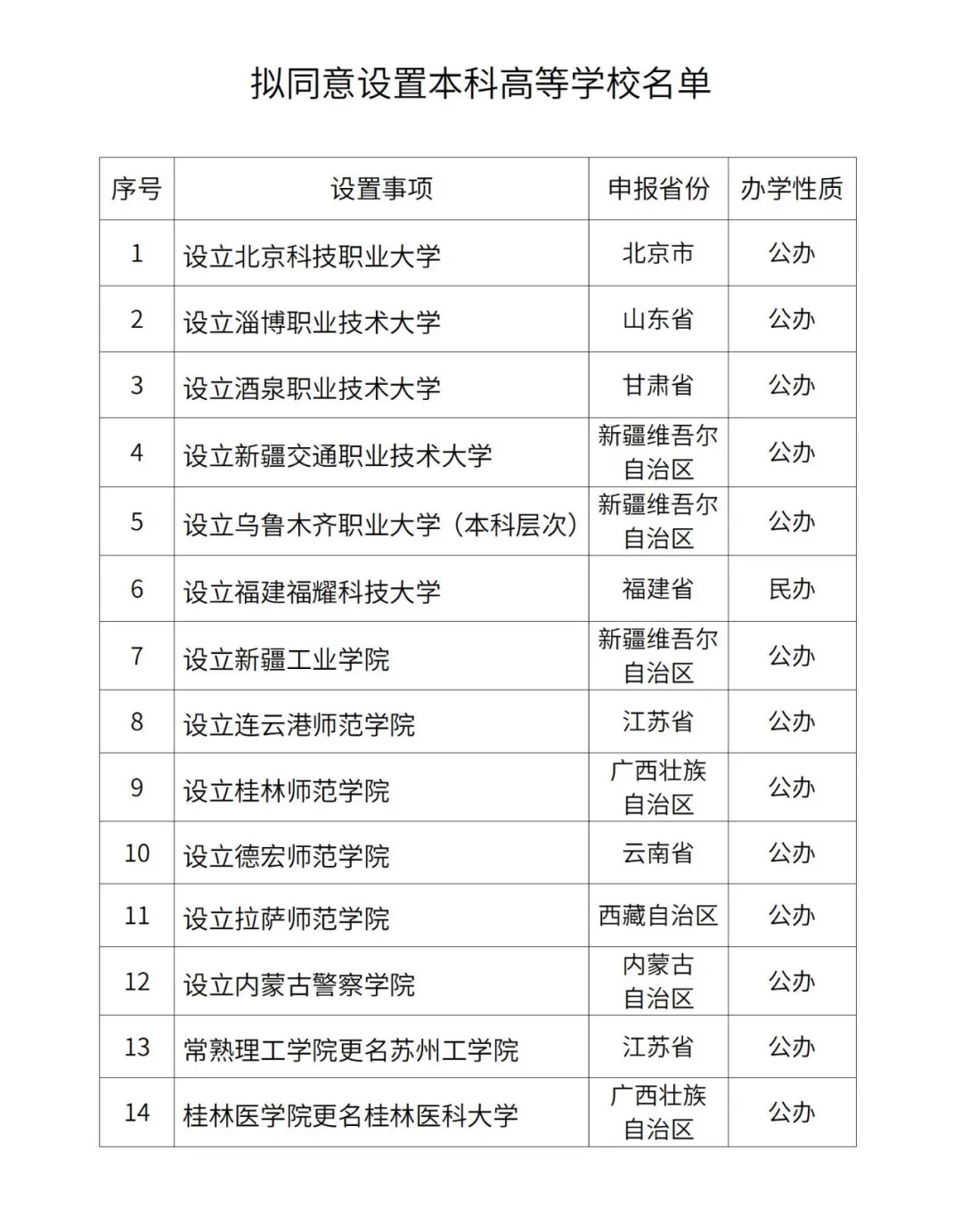 擬同意設置北京科技職業大學等14所學校