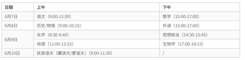 具體安排為:6月7日上午9:00-11:30考語(yǔ)文,下午15:00-17:00考數(shù)學(xué);6月8日上午9:00-10:15考物理或歷史,下午15:00-17:00考外語(yǔ);6月9日上午8:30-9:45考化學(xué),11:00-12:15考地理,下午14:30-15:45考思想政治,17:00-18:15考生物學(xué);6月10日上午9:00-11:30考民族語(yǔ)文。