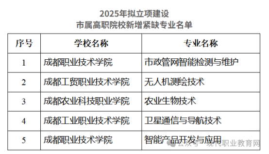 日前,成都市教育局發布《2025年市屬高職院校新增緊缺專業建設項目名單公示》,擬遴選建設5個市屬高職院校新增緊缺專業,包括:市政管網智能檢測與維護、無人機測繪技術、農業生物技術、衛星通信與導航技術、智能產品開發與應用。