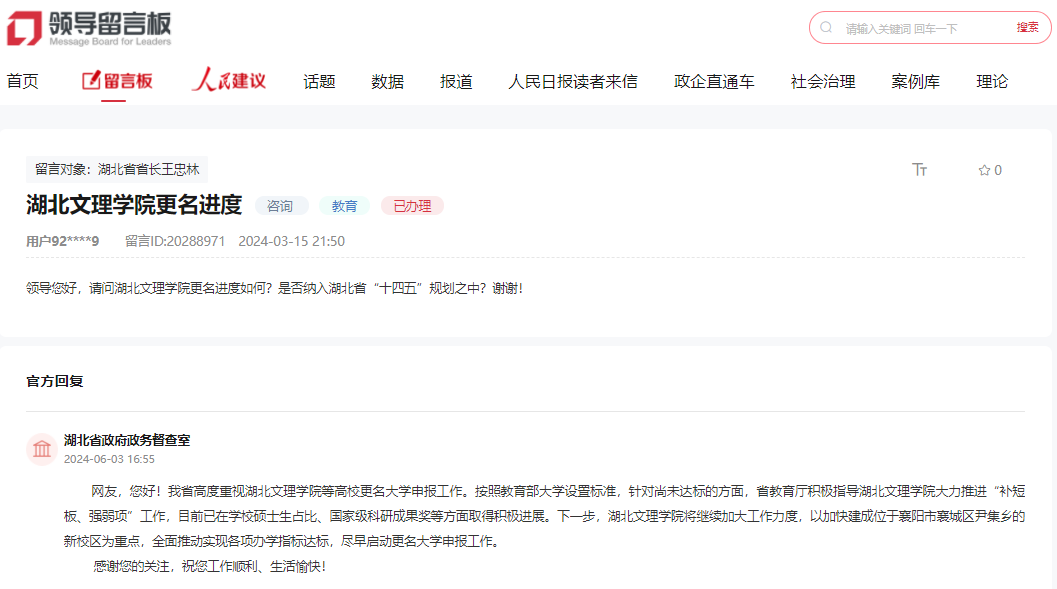 2024年3月,有網友通過人民網領導留言板咨詢“湖北文理學院更名大學的進展”,湖北省政府政務督查室回復表示:“目前已在學校碩士生占比、國家級科研成果獎等方面取得積極進展。下一步,湖北文理學院將繼續加大工作力度,以加快建成位于襄陽市襄城區尹集鄉的新校區為重點,全面推動實現各項辦學指標達標,盡早啟動更名大學申報工作。”