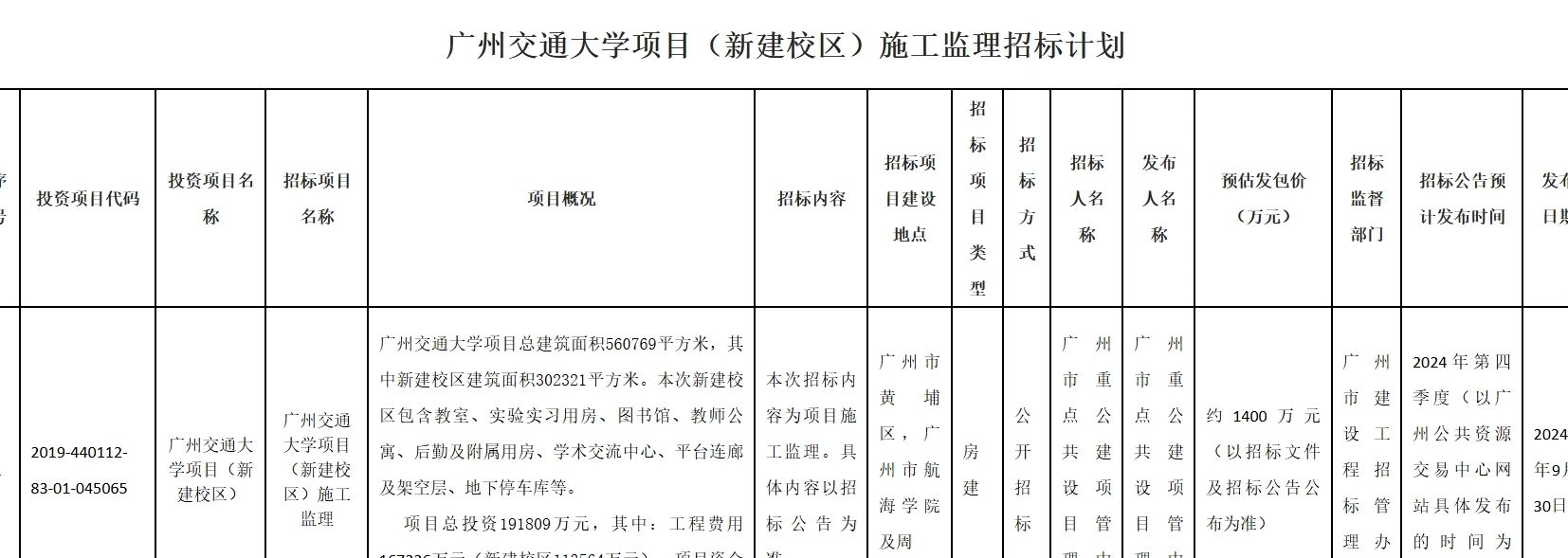 據招標計劃顯示,廣州交通大學項目總建筑面積560769平方米,其中新建校區建筑面積302321平方米。項目總投資191809萬元,其中:工程費用167226萬元(新建校區113564萬元)。項目資金來源為市本級基本建設統籌資金。