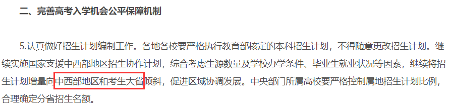 2月,教育部發布《關于做好2021年普通高校招生工作的通知》,《通知》中關于“完善高考入學機會公平保障機制”的部分,提到“繼續將招生計劃增量向中西部地區和考生大省傾斜”。