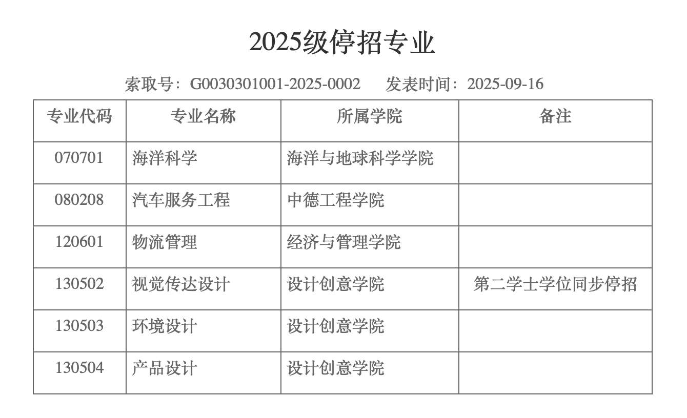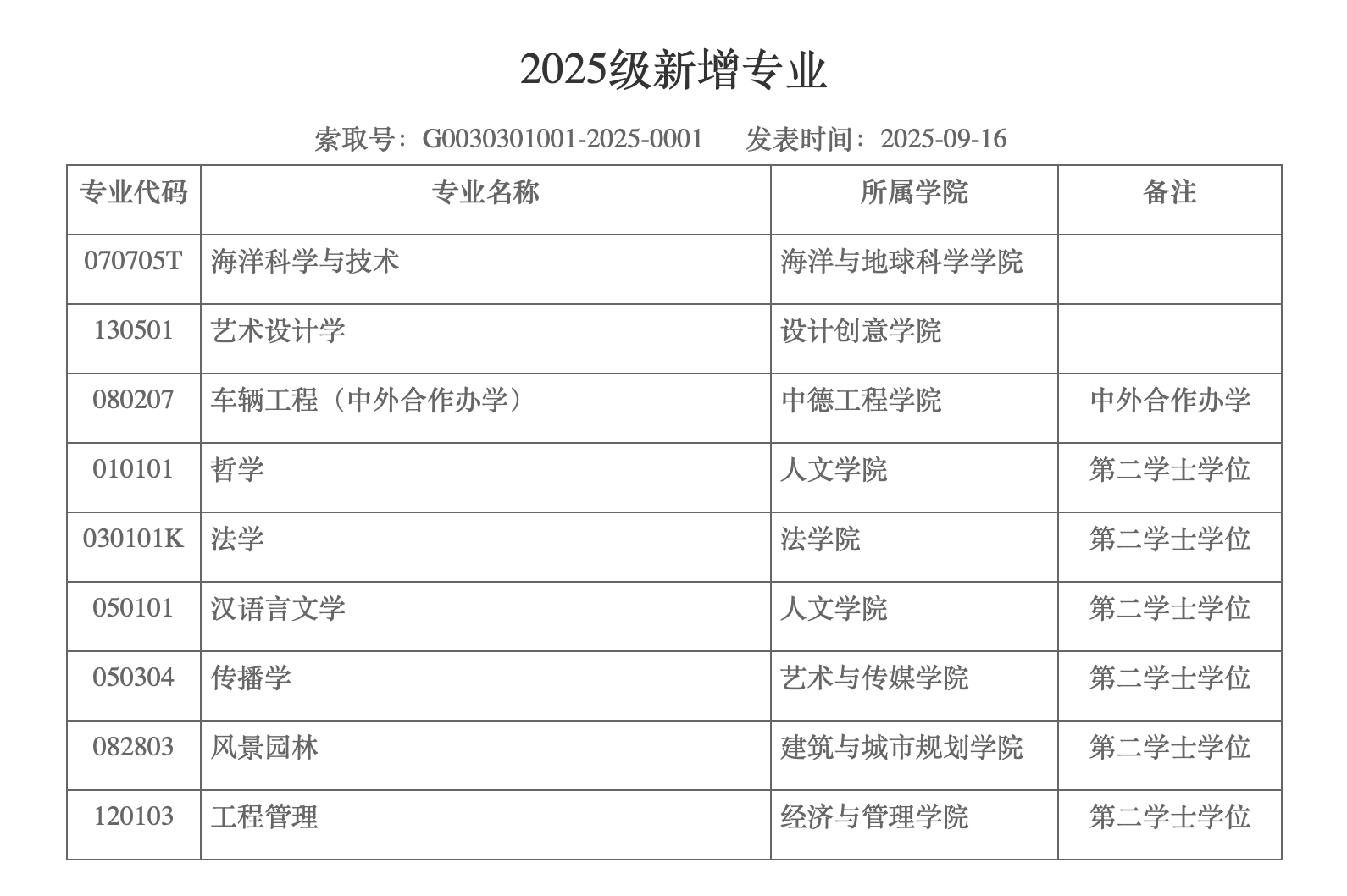 學校2025級新增專業為:海洋科學與技術、藝術設計學、車輛工程(中外合作辦學)、哲學(第二學士學位)、法學