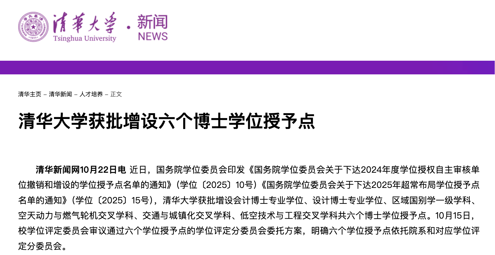 據(jù)清華大學(xué)新聞網(wǎng)消息,近日,國(guó)務(wù)院學(xué)位委員會(huì)印發(fā)《國(guó)務(wù)院學(xué)位委員會(huì)關(guān)于下達(dá)2024年度學(xué)位授權(quán)自主審核單位撤銷和增設(shè)的學(xué)位授予點(diǎn)名單的通知》(學(xué)位〔2025〕10號(hào))《國(guó)務(wù)院學(xué)位委員會(huì)關(guān)于下達(dá)2025年超常布局學(xué)位授予點(diǎn)名單的通知》(學(xué)位〔2025〕15號(hào)),清華大學(xué)獲批增設(shè)會(huì)計(jì)博士專業(yè)學(xué)位、設(shè)計(jì)博士專業(yè)學(xué)位、區(qū)域國(guó)別學(xué)一級(jí)學(xué)科、空天動(dòng)力與燃?xì)廨啓C(jī)交叉學(xué)科、交通與城鎮(zhèn)化交叉學(xué)科、低空技術(shù)與工程交叉學(xué)科共六個(gè)博士學(xué)位授予點(diǎn)。