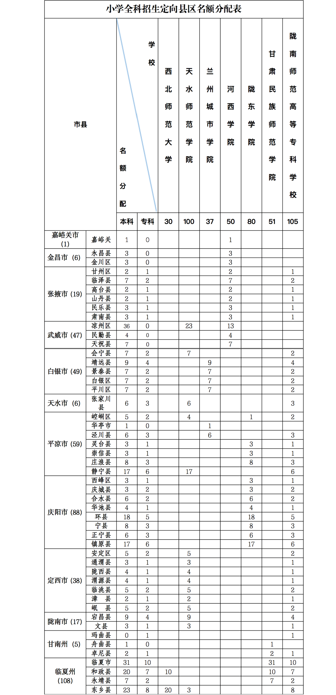 該計劃采取“指標到縣、傾向招生、簽訂協議、合格聘用、定向服務”的培養模式,培養院校為西北師范大學、蘭州城市學院、天水師范學院、河西學院、隴東學院、甘肅民族師范學院、隴南師范高等專科學校,培養專業為小學教育專業,服務方向為鄉鎮及鄉鎮以下學校。