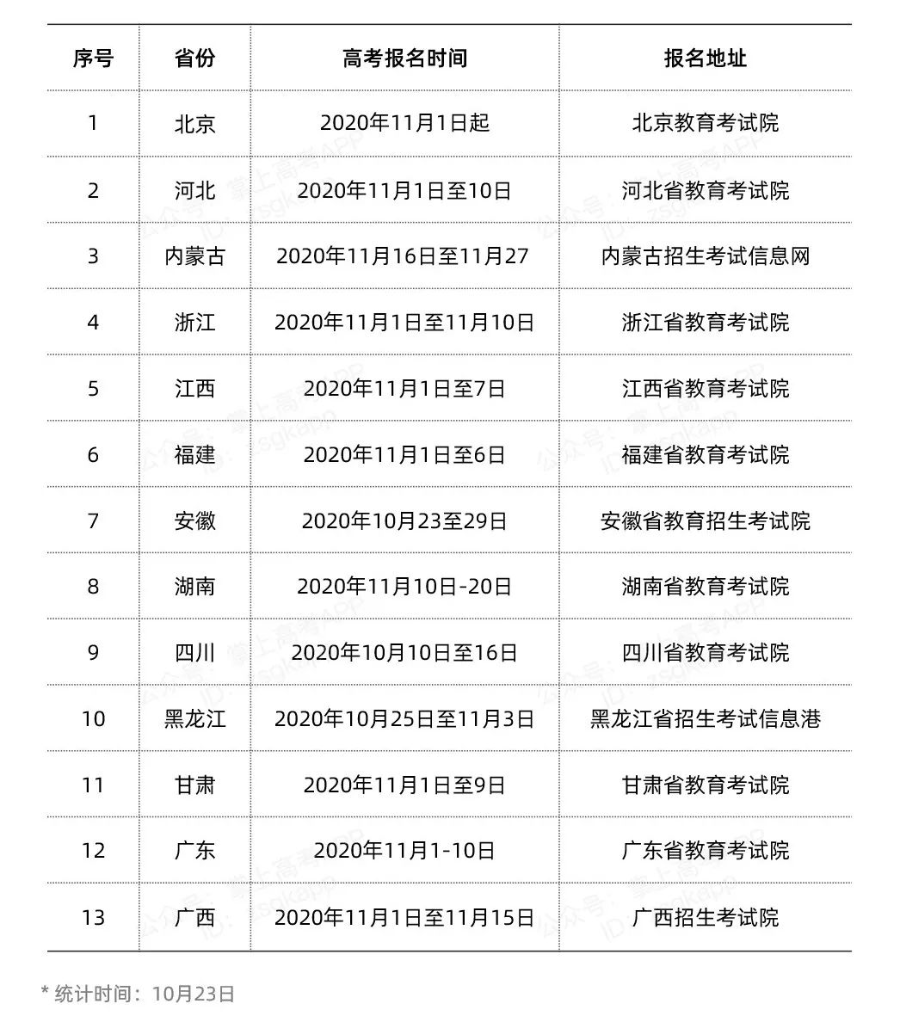 截至目前,已有北京、河北、內(nèi)蒙古、浙江、江西、福建、安徽、湖南、四川、黑龍江、甘肅、廣東、廣西等13省市公布2021年高考報(bào)名時(shí)間。