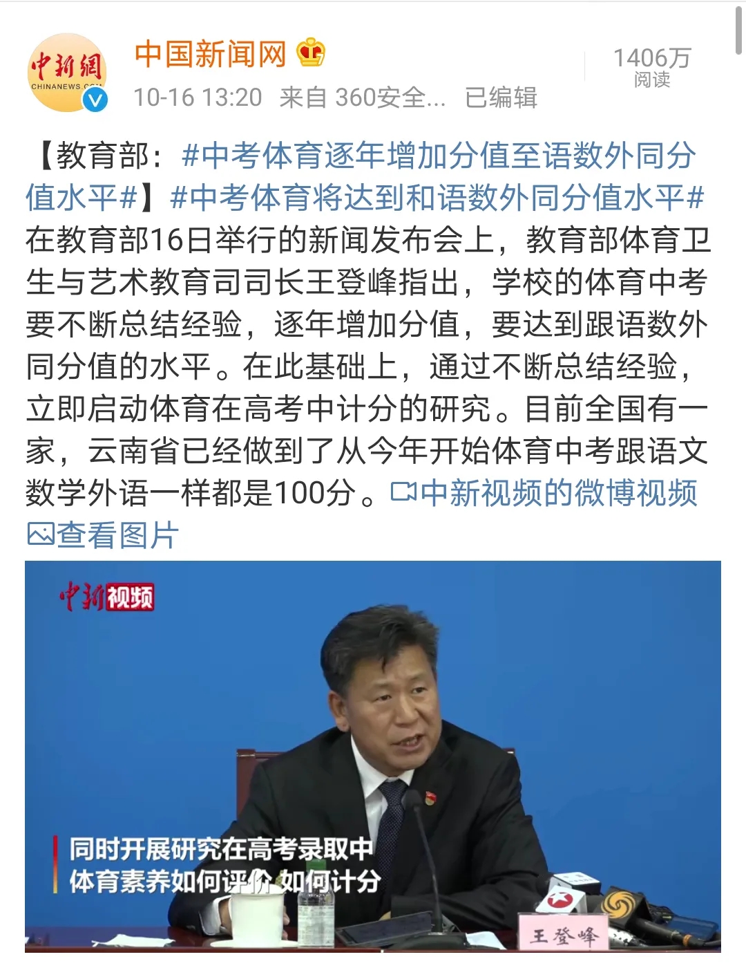 云南的中考改革中,體育分數(shù)提高到了100分,全國多地的中考改革也將體育分值提高。