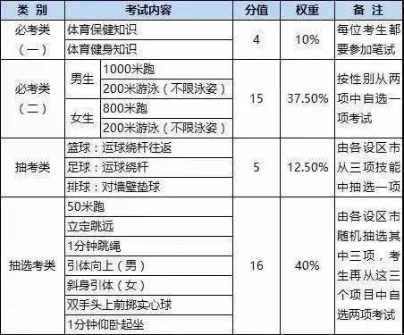 體育考試仍然采用“1+1”方式,即1個必考科目加1個選考科目(必考科目與選考科目不能重復(fù))。必考科目和選考科目所占的比重各為50%。