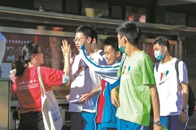 6月10日,在北京師范大學(xué)第二附屬中學(xué)考點(diǎn)外,老師同走出考場(chǎng)的考生擊掌。本報(bào)記者 單藝偉 攝