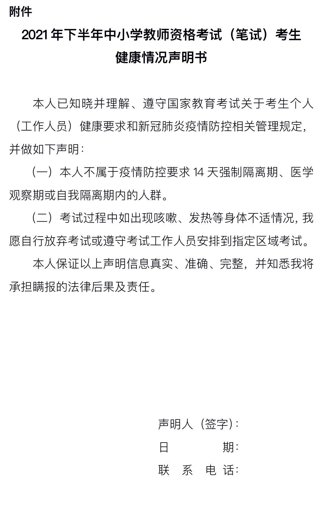 1.防疫須知:考生須自備口罩前往考點,自覺接受體溫檢測,并提交有效期內(nèi)“甘肅省健康出行碼”截圖A4紙打印件和《2021年下半年中小學教師資格考試(筆試)考生健康情況聲明書》(須本人簽字,如報考多個科目,只需參加首場考試時提交即可),考前14天內(nèi)有中、高風險地區(qū)旅居史和“甘肅省健康出行碼”為“非綠碼”的考生,還須提交考前48小時內(nèi)有效新冠病毒核酸檢測陰性報告原件,方可進入考點參加考試,如無法提供相關健康證明的考生將嚴禁入場考試。