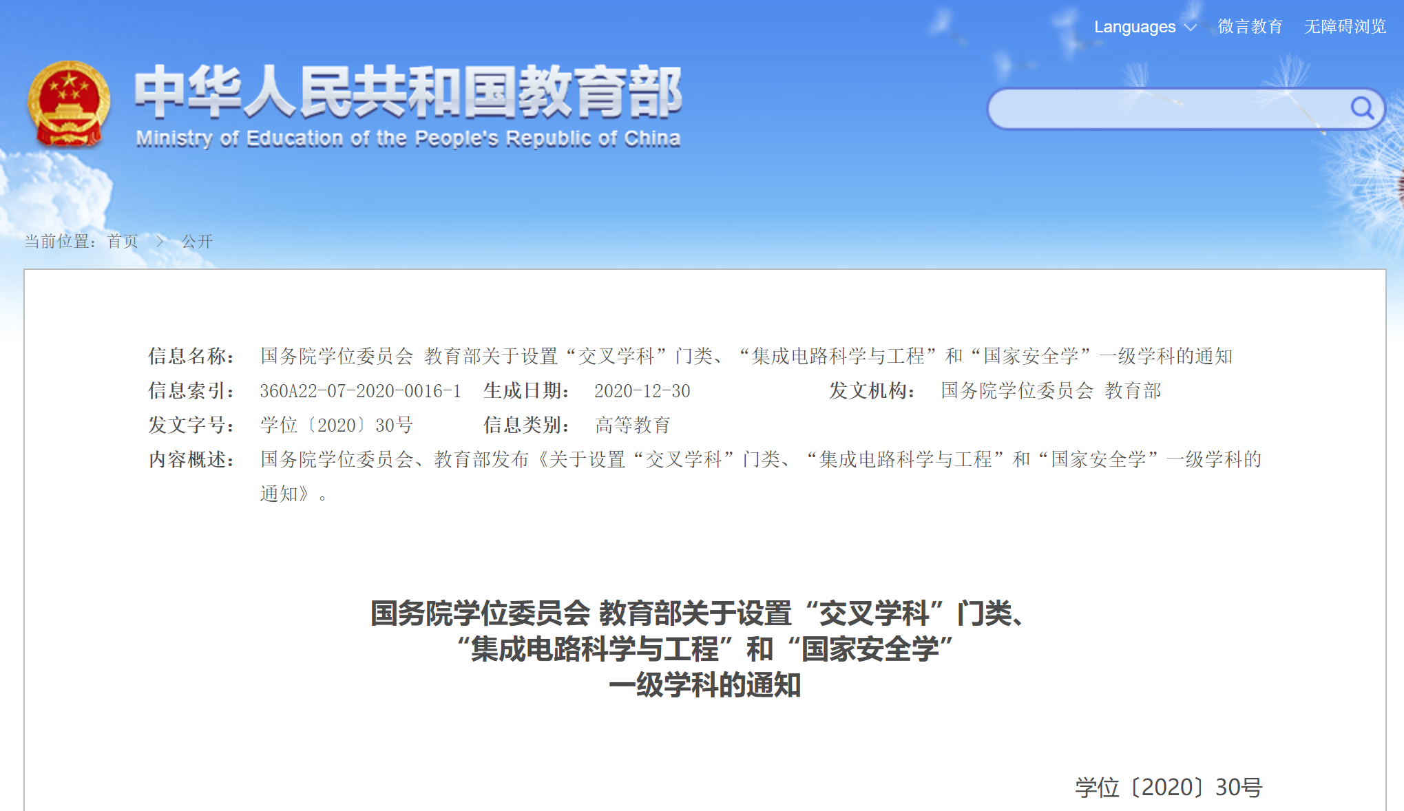 今年1月份,教育部發(fā)布通知,決定設(shè)置“交叉學(xué)科”門類(門類代碼為“14”)、“集成電路科學(xué)與工程”一級(jí)學(xué)科和“國(guó)家安全學(xué)”一級(jí)學(xué)科。