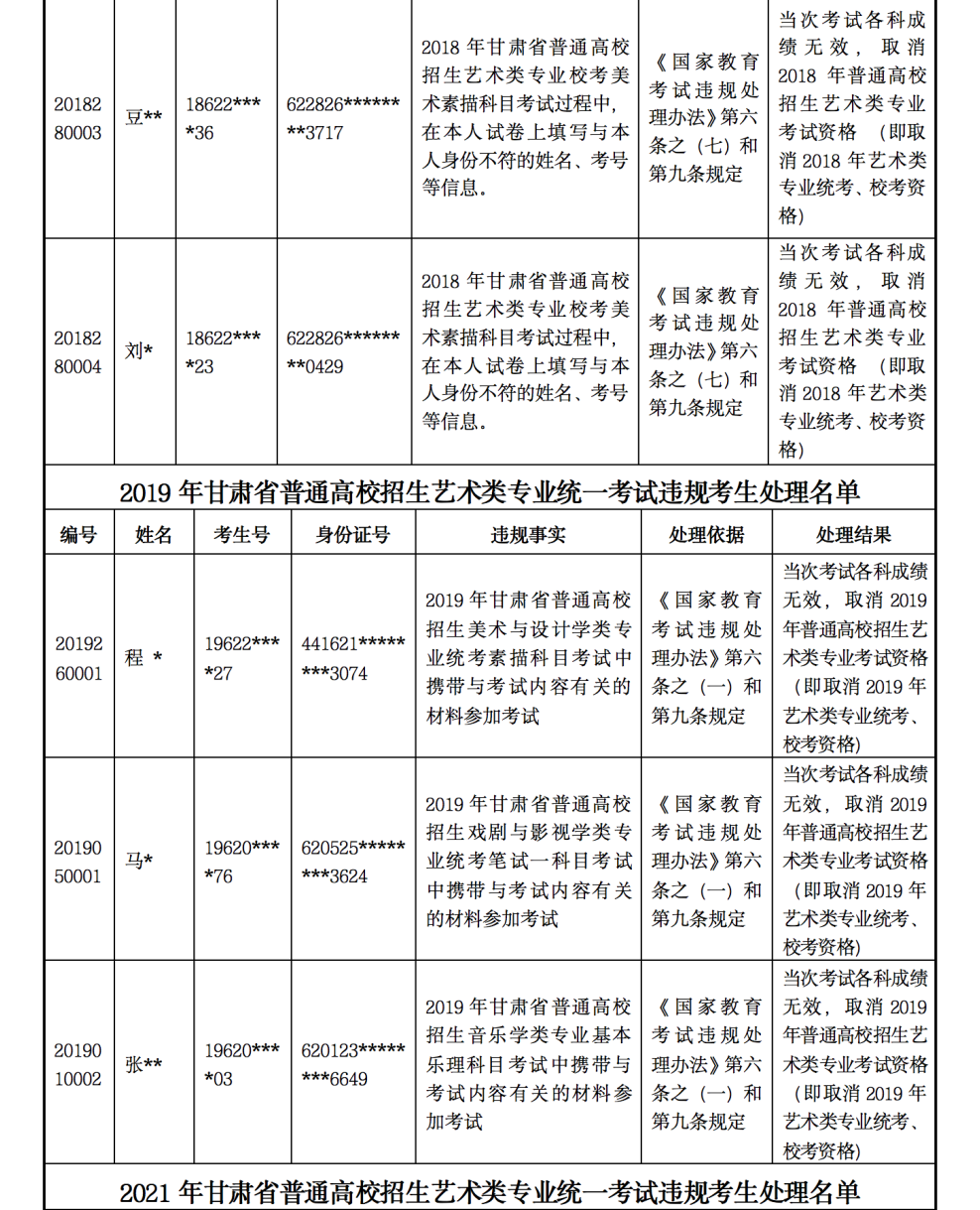 一、甘肅省近年普通高校招生藝術類專業違規考生處理情況回顧