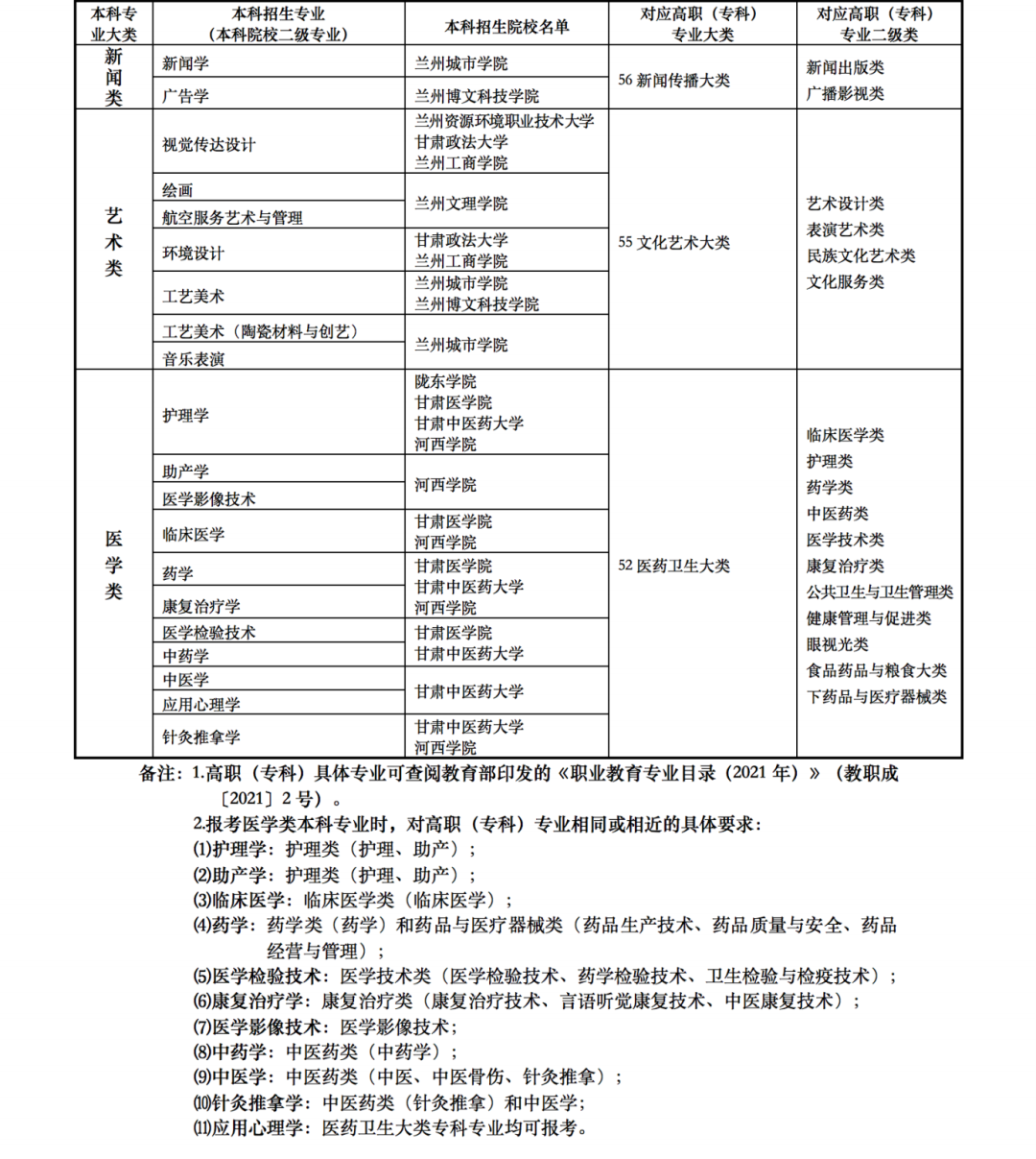 (三)按照高職(??疲I二級類(除醫藥衛生類)與普通本科、職業本科招生二級專業相同或相近對應的原則進行報名,在同一專業大類內可以跨二級專業報考。醫藥衛生大類的考生須嚴格按照《2022年甘肅省普通專升本高職(專科)和本科專業大類對照表以及招生學校及專業目錄》備注欄具體要求報考。