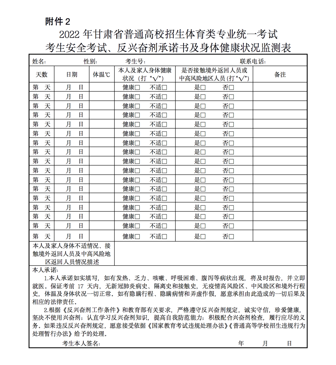 2.2022年甘肅省普通高校招生體育類專業統一考試考生安全考試、反興奮劑承諾書及身體健康狀況監測表