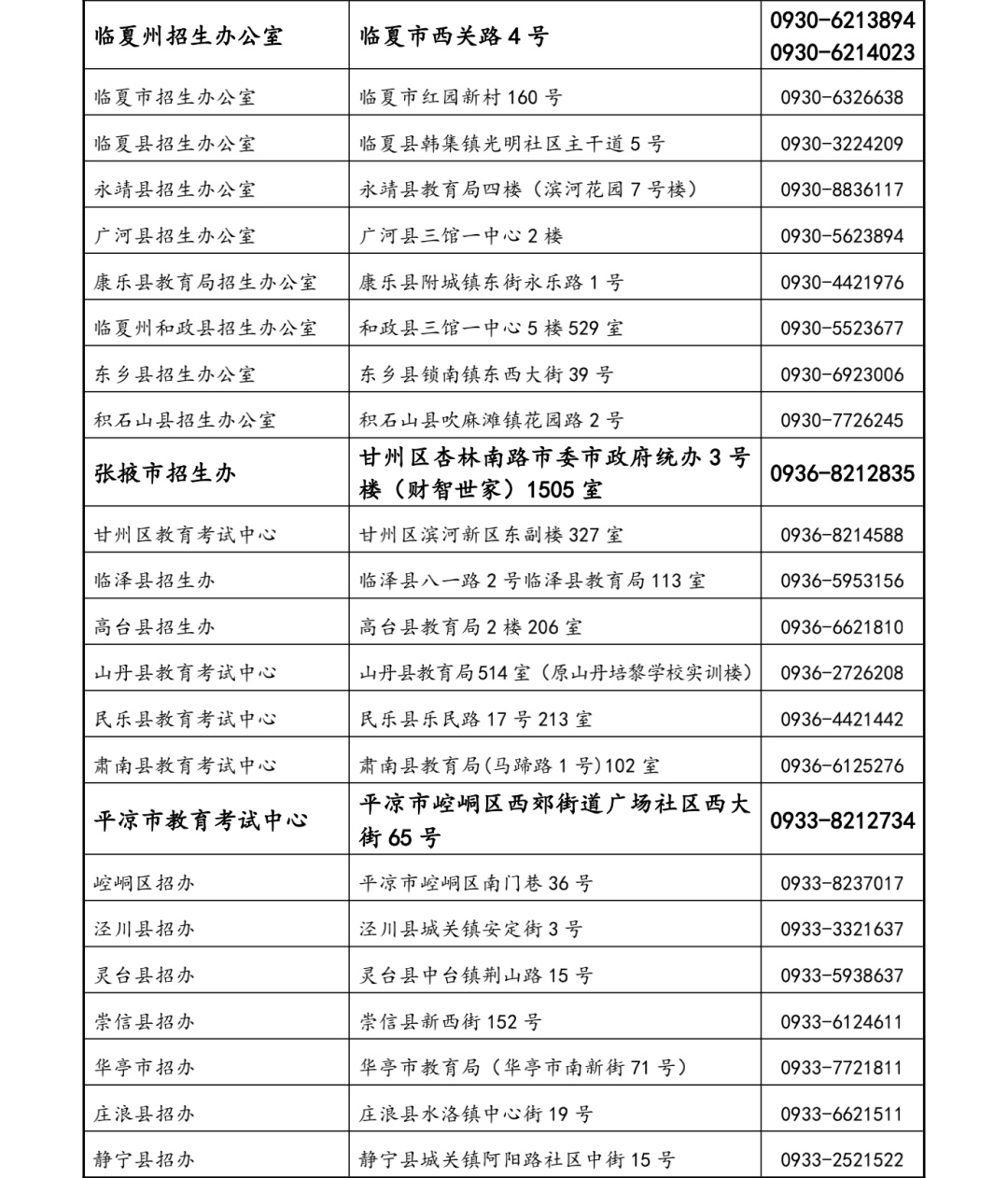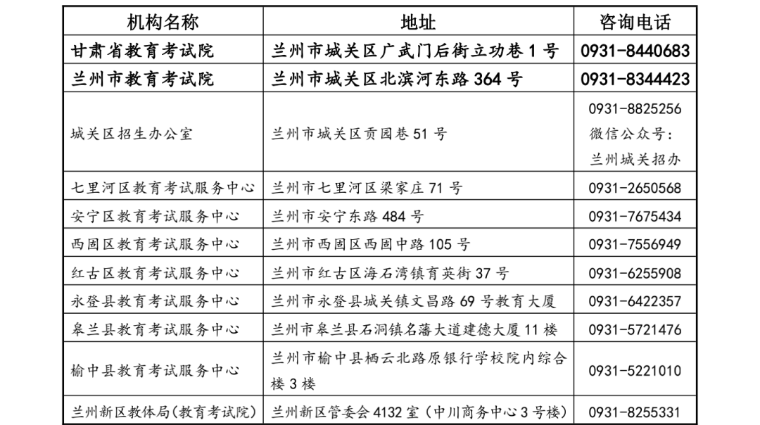 2022 年甘肅省各級教育考試招生機構咨詢服務聯系方式