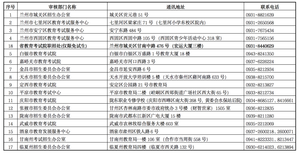 免試入學考生線下審核地點為甘肅省教育考試院職業教育招生處;其他考生線下審核到相關市(州)教育考試招生機構(蘭州市在城關區招生辦公室、七里河區教育考試服務中心、安寧區教育考試服務中心、西固區教育考試服務中心等審核)。