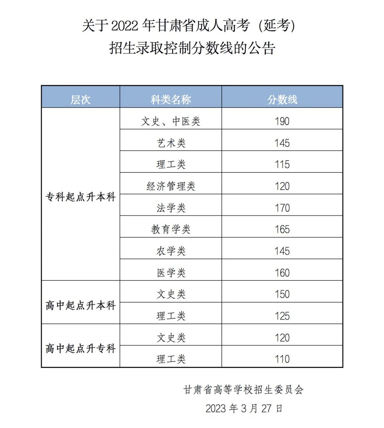 2022年甘肅省成人高考(延考)招生錄取控制分?jǐn)?shù)線