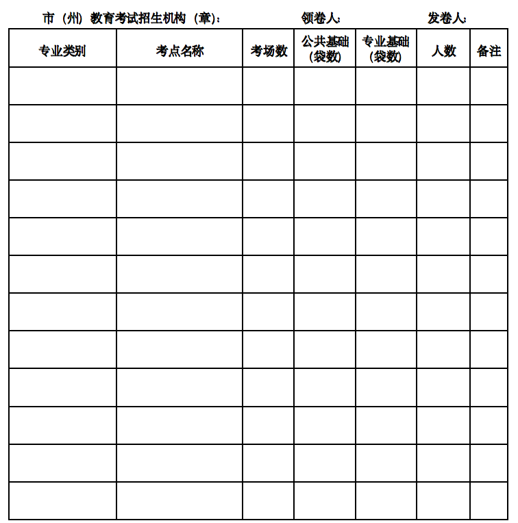 中職升學(xué)文化素質(zhì)考試考場由省教育考試院編排,具體考試組織由省教育考試院委托省職業(yè)技術(shù)教育中心牽頭,由各市(州)教育局負責(zé)實施。考務(wù)管理參照《2023年甘肅省普通高等學(xué)校招生全國統(tǒng)一考試考務(wù)管理工作規(guī)定》執(zhí)行,考試實行“裸考”,統(tǒng)一使用文具,由各市(州)統(tǒng)一管理。編排考場后,省教育考試院將報名數(shù)據(jù)轉(zhuǎn)至省職業(yè)技術(shù)教育中心,省職業(yè)技術(shù)教育中心會同各市(州)教育局負責(zé)制定印卷計劃,各市(州)教育局須于5月6日前將《2023年甘肅省高等職業(yè)教育分類考試招生中職升學(xué)專業(yè)考試試卷訂購表》(見附件4)簽字蓋章上報省職業(yè)技術(shù)教育中心。省職業(yè)技術(shù)教育中心負責(zé)考試命題、制卷、評卷、統(tǒng)分及成績公布等工作,并于6月20前將考試數(shù)據(jù)(見附件5)報送省教育考試院。