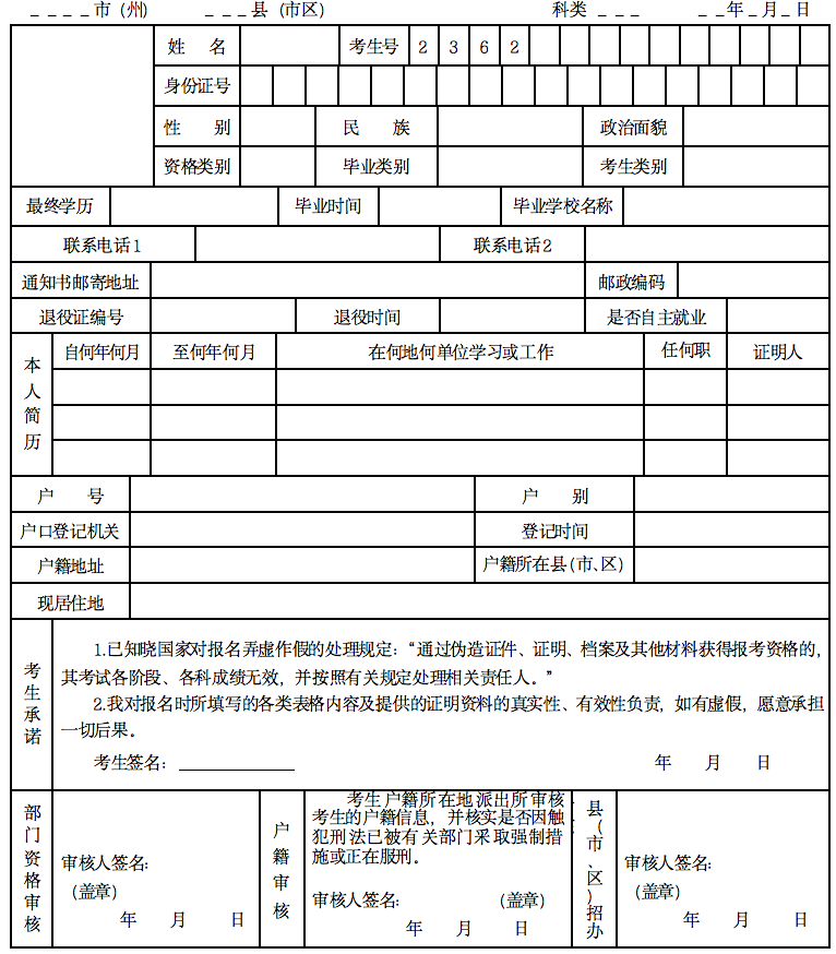 8.“部門資格審核”欄。應(yīng)往屆普通高中和中職畢業(yè)生報名資格由考生就讀學(xué)校所在地縣(市、區(qū))教育部門統(tǒng)一確認。應(yīng)往屆技工學(xué)校畢業(yè)生報名資格由考生就讀學(xué)校學(xué)生學(xué)籍管理所屬人社部門統(tǒng)一確認。下崗職工報名資格由考生戶籍所在地縣(市、區(qū))人社部門統(tǒng)一確認。農(nóng)民工、高素質(zhì)農(nóng)民報名資格由考生戶籍所在地縣(市、區(qū))農(nóng)業(yè)農(nóng)村部門統(tǒng)一確認。退役軍人報名資格由考生落戶所在地縣(市、區(qū))退役軍人事務(wù)管理部門統(tǒng)一確認。