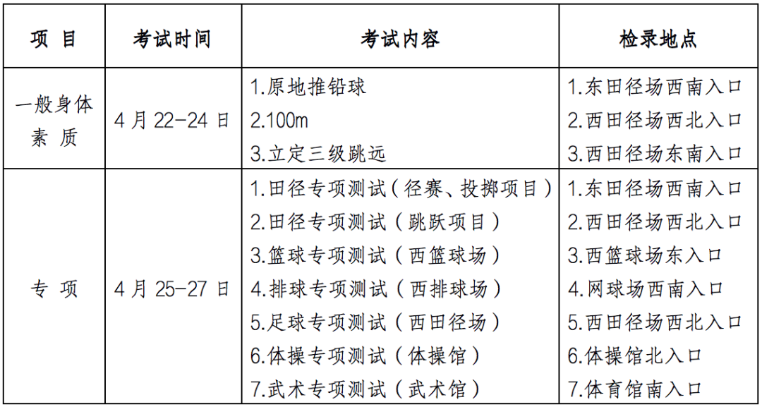 4.測試采用分組輪換、集中測試的方式進行,4月22-24日為一般身體素質測試,4月25-27日為專項測試,考生具體考試時間以《報名登記表》為準。