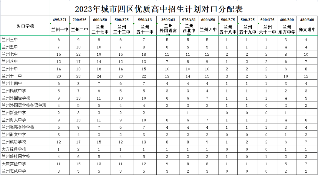 2023年蘭州市中考招生錄取,城市四區內的師大附中、蘭州一中、蘭州二中、蘭州二十七中、蘭州三十三中、蘭州五十一中、蘭州市外國語高中、蘭州西北中學、蘭州四中、蘭州五十八中、蘭州五十九中、蘭州六十一中、蘭州東方中學等13所優質高中(含蘭州六十一中新區分校、蘭州三十三中東城分校),