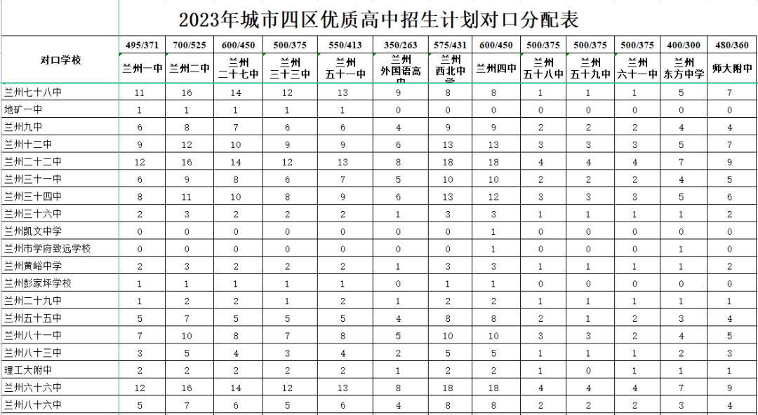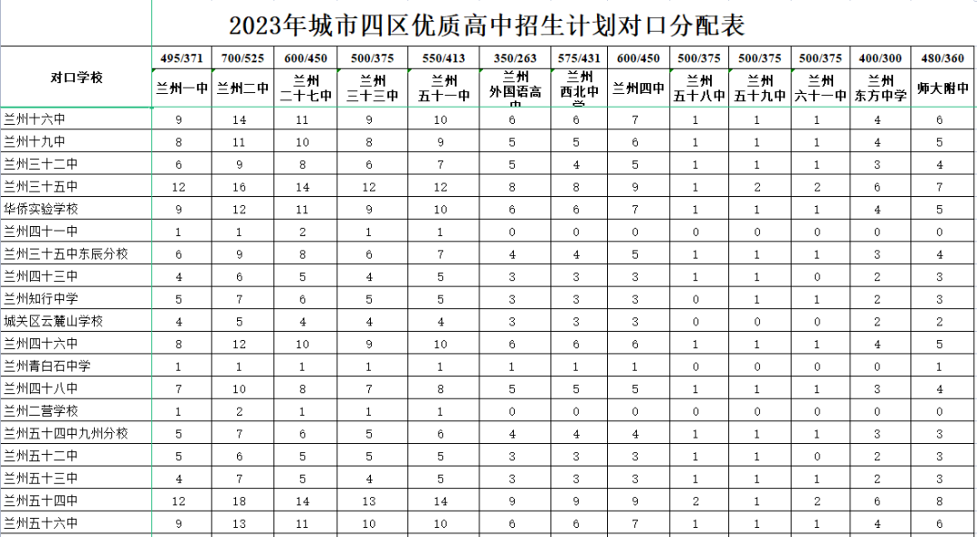 2023年蘭州市繼續實行優質高中部分招生名額對口分配到初中學校的招生政策,省級示范性高中(不含特色班)對口分配比例為75%,蘭州六十一中新區分校對口分配比例為35%,蘭州三十三中東城分校分配比例為20%。城市四區省級示范性高中名額分配范圍為城市四區內初中學校,蘭州三十三中東城分校名額分配范圍為高新區內初中學校,蘭州六十一中新區分校名額分配范圍為蘭州新區內初中學校。