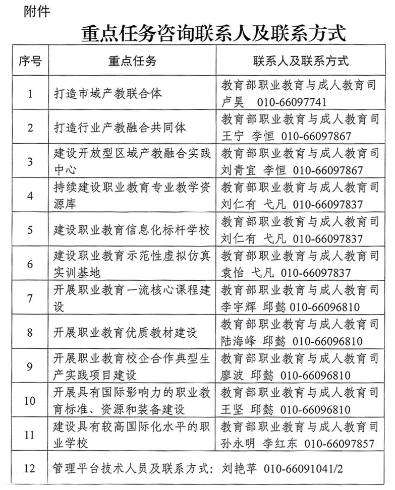 各重點(diǎn)任務(wù)建設(shè)指南將在現(xiàn)代職業(yè)教育體系改革管理公共信息服務(wù)平臺(tái)(網(wǎng)址:http://zj.chinaafse.cn/, 以下簡(jiǎn)稱管理平臺(tái)) 予以公布。各地要積極組織有關(guān)政府部門、學(xué)校、企業(yè)、產(chǎn)業(yè)園 區(qū)承接重點(diǎn)任務(wù),明確各重點(diǎn)任務(wù)牽頭建設(shè)單位(以下簡(jiǎn)稱建設(shè)單位),根據(jù)各重點(diǎn)任務(wù)建設(shè)指南的要求,整合教育產(chǎn)業(yè)政策資源、形成建設(shè)方案(含年度績(jī)效目標(biāo))并上傳管理平臺(tái),自主開展建設(shè),接受監(jiān)督調(diào)度。各項(xiàng)目咨詢聯(lián)系人及聯(lián)系方式見附件。