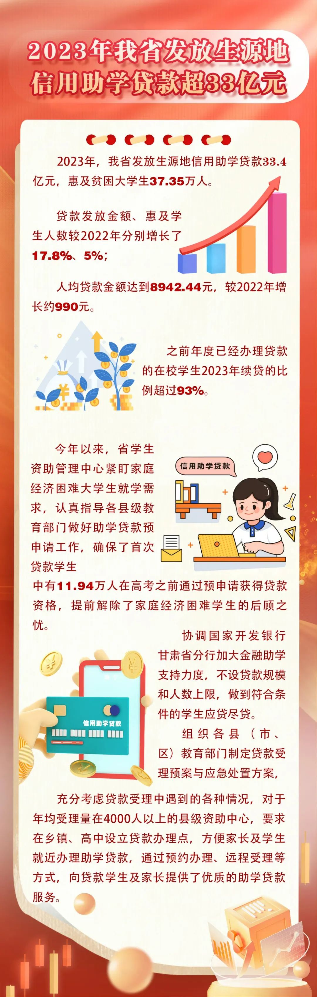 近日,記者從甘肅省教育廳了解到,2023年,甘肅發(fā)放生源地信用助學貸款33.4億元,惠及貧困大學生37.35萬人。貸款發(fā)放金額、惠及學生人數(shù)較2022年分別增長了17.8%、5%;人均貸款金額達到8942.44元,較2022年增長約990元。