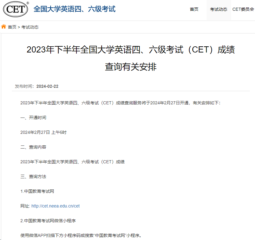 據教育部教育考試院消息,2023年下半年全國大學英語四、六級考試成績查詢服務將于2月27日6時開通,考生可通過中國教育考試網及其相關小程序進行查詢。